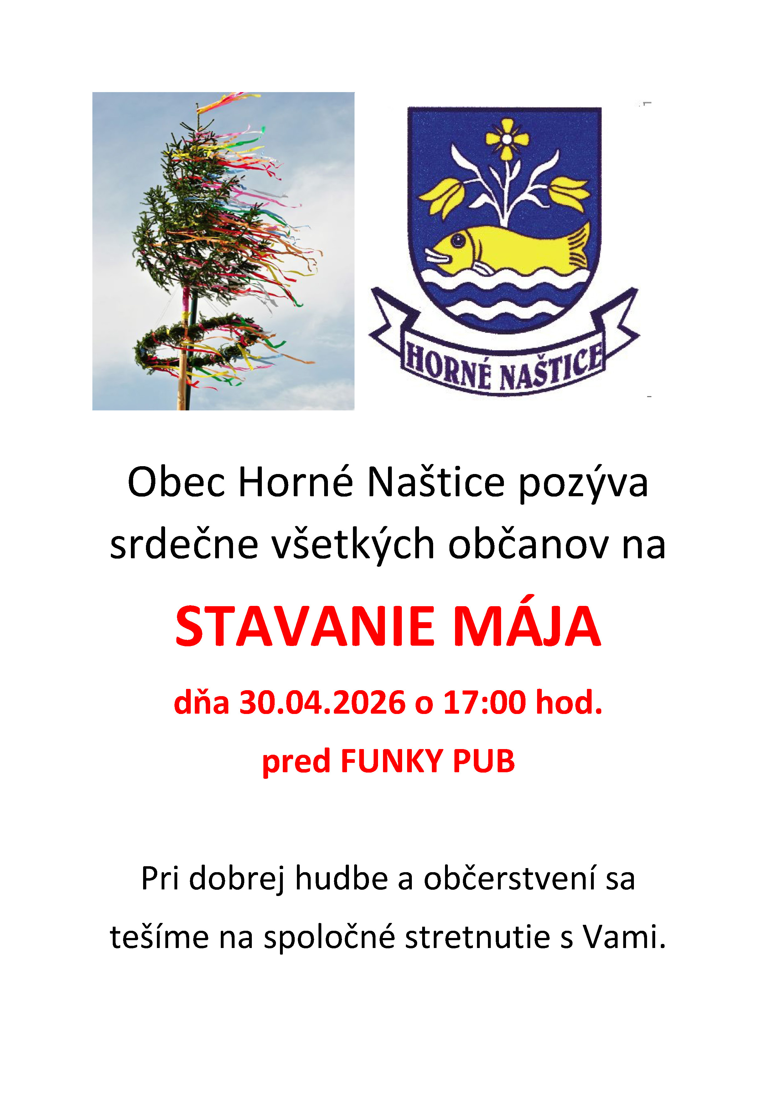 Obec Horné Naštice pozýva srdečne všetkých občanov na STAVANIE MÁJA dňa 30.04.2026 o 17:00 hod. pred FUNKY PUB